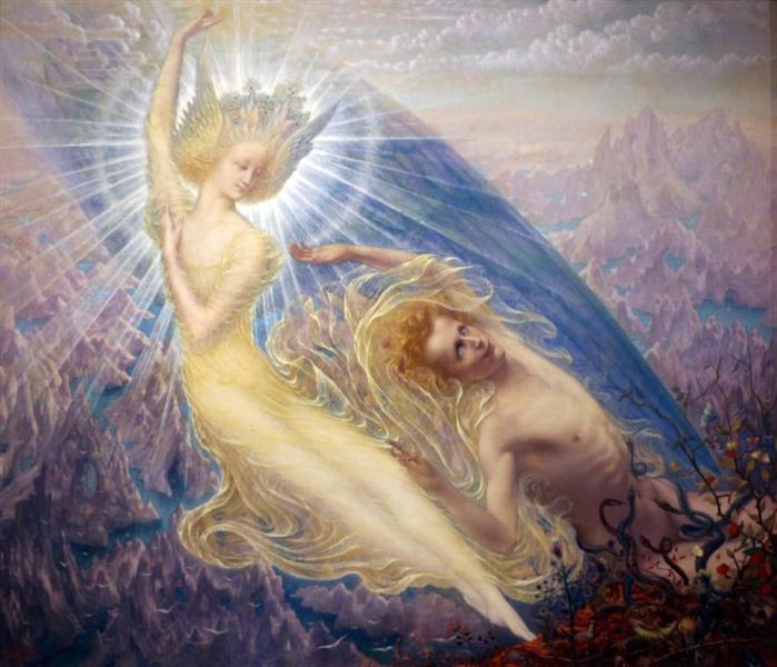 También investigamos sobre un personaje esotérico muy emblemático en esos años: Joséphin Péladan y su conexión con lo esotérico. Por último tomamos la obra de Jean Delville donde la figura del andrógino surge como el símbolo máximo de la perfección espiritual: la unión de los opuestos que marca el fin de la dualidad terrestre. A su vez su obra nos conecta con la evolución del alma y la transmutación de la materia hacia la luz.
